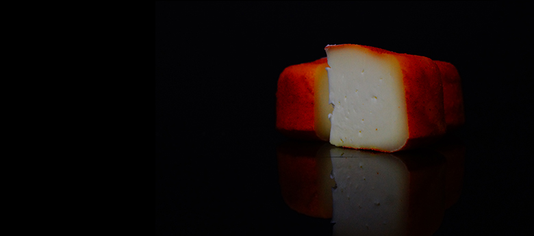 Queijo curado de pasta cor amarela clara, medianamente amanteigada, obtido por dessoramento após coagulação de leite de vaca, barrado com pimentão.
